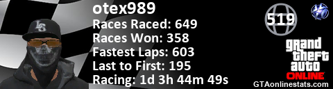 <a href="http://GTAonlinestats.com/showplayer/otex989"><img src="http://GTAonlinestats.com/racesignature/otex989/sig.png" alt="Otex989" border="0" /></a>