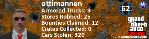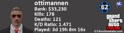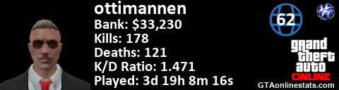 [URL=http://GTAonlinestats.com/showplayer/ottimannen][IMG]http://GTAonlinestats.com/signature/ottimannen/sig.png[/IMG][/URL]