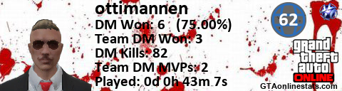 [URL=http://GTAonlinestats.com/showplayer/ottimannen][IMG]http://GTAonlinestats.com/dmsignature/ottimannen/sig.png[/IMG][/URL]