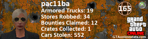 <a href="http://GTAonlinestats.com/showplayer/pac11ba"><img src="http://GTAonlinestats.com/crimesignature/pac11ba/sig.png" alt="pac11ba" border="0" /></a>