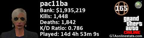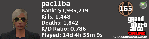 <a href="http://GTAonlinestats.com/showplayer/pac11ba"><img src="http://GTAonlinestats.com/dmsignature/pac11ba/sig.png" alt="pac11ba" border="0" /></a>
