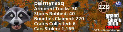 <a href="http://GTAonlinestats.com/showplayer/palmyrasq"><img src="http://GTAonlinestats.com/crimesignature/palmyrasq/sig.png" alt="PalmyraSq" border="0" /></a>