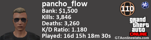 [URL=http://GTAonlinestats.com/showplayer/pancho_flow][IMG]http://GTAonlinestats.com/signature/pancho_flow/sig.png[/IMG][/URL]