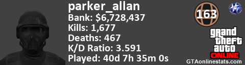 <a href="http://GTAonlinestats.com/showplayer/parker_allan"><img src="http://GTAonlinestats.com/greysignature/parker_allan/sig.png" alt="parker_allan" border="0" /></a>