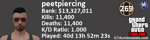<a href="http://GTAonlinestats.com/showplayer/peetpiercing"><img src="http://GTAonlinestats.com/randomsignature/peetpiercing/sig.png" alt="peetpiercing" border="0" /></a>