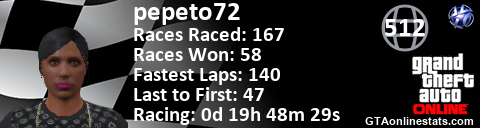 [URL=http://GTAonlinestats.com/showplayer/pepeto72][IMG]http://GTAonlinestats.com/racesignature/pepeto72/sig.png[/IMG][/URL]