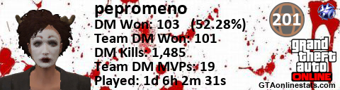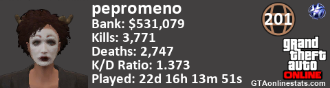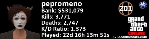 [URL=http://GTAonlinestats.com/showplayer/pepromeno][IMG]http://GTAonlinestats.com/dmsignature/pepromeno/sig.png[/IMG][/URL]