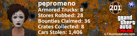 [URL=http://GTAonlinestats.com/showplayer/pepromeno][IMG]http://GTAonlinestats.com/randomsignature/pepromeno/sig.png[/IMG][/URL]