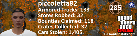 [URL=http://GTAonlinestats.com/showplayer/piccoletta82][IMG]http://GTAonlinestats.com/randomsignature/piccoletta82/sig.png[/IMG][/URL]