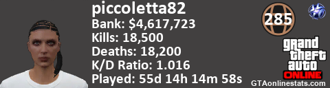 [URL=http://GTAonlinestats.com/showplayer/piccoletta82][IMG]http://GTAonlinestats.com/signature/piccoletta82/sig.png[/IMG][/URL]