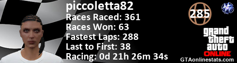 [URL=http://GTAonlinestats.com/showplayer/piccoletta82][IMG]http://GTAonlinestats.com/racesignature/piccoletta82/sig.png[/IMG][/URL]