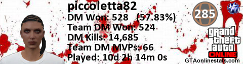 [URL=http://GTAonlinestats.com/showplayer/piccoletta82][IMG]http://GTAonlinestats.com/dmsignature/piccoletta82/sig.png[/IMG][/URL]