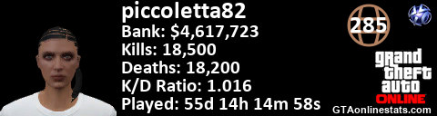 <a href="http://GTAonlinestats.com/showplayer/piccoletta82"><img src="http://GTAonlinestats.com/signature/piccoletta82/sig.png" alt="piccoletta82" border="0" /></a>