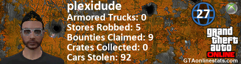 [URL=http://GTAonlinestats.com/showplayer/plexidude/5][IMG]http://GTAonlinestats.com/crimesignature/plexidude/5/sig.png[/IMG][/URL]