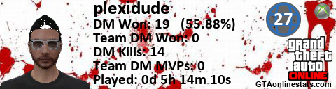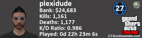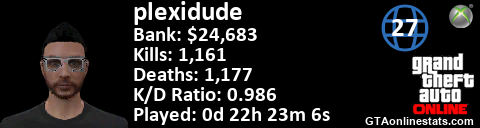 <a href="http://GTAonlinestats.com/showplayer/plexidude/5"><img src="http://GTAonlinestats.com/dmsignature/plexidude/5/sig.png" alt="plexidude" border="0" /></a>