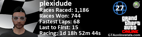 <a href="http://GTAonlinestats.com/showplayer/plexidude/5"><img src="http://GTAonlinestats.com/racesignature/plexidude/5/sig.png" alt="plexidude" border="0" /></a>