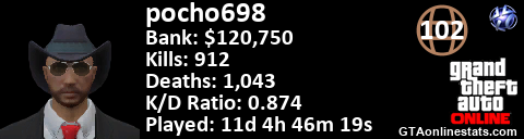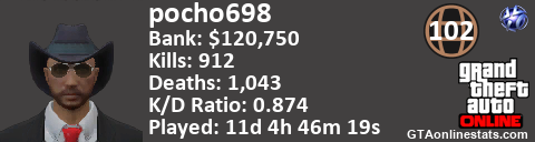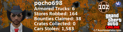 <a href="http://GTAonlinestats.com/showplayer/pocho698"><img src="http://GTAonlinestats.com/randomsignature/pocho698/sig.png" alt="pocho698" border="0" /></a>