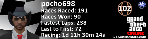 <a href="http://GTAonlinestats.com/showplayer/pocho698"><img src="http://GTAonlinestats.com/racesignature/pocho698/sig.png" alt="pocho698" border="0" /></a>
