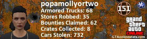 [URL=http://GTAonlinestats.com/showplayer/popamollyortwo][IMG]http://GTAonlinestats.com/crimesignature/popamollyortwo/sig.png[/IMG][/URL]
