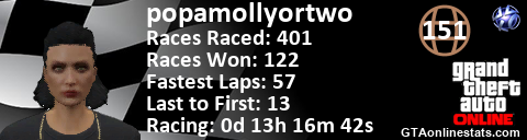 [URL=http://GTAonlinestats.com/showplayer/popamollyortwo][IMG]http://GTAonlinestats.com/racesignature/popamollyortwo/sig.png[/IMG][/URL]
