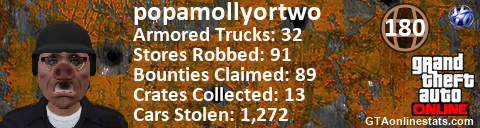[URL=http://GTAonlinestats.com/showplayer/popamollyortwo/2][IMG]http://GTAonlinestats.com/crimesignature/popamollyortwo/2/sig.png[/IMG][/URL]