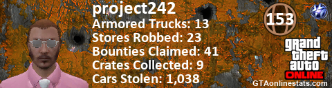 [URL=http://GTAonlinestats.com/showplayer/project242][IMG]http://GTAonlinestats.com/crimesignature/project242/sig.png[/IMG][/URL]