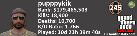 <a href="http://GTAonlinestats.com/showplayer/pupppykik"><img src="http://GTAonlinestats.com/signature/pupppykik/sig.png" alt="pupppykik" border="0" /></a>