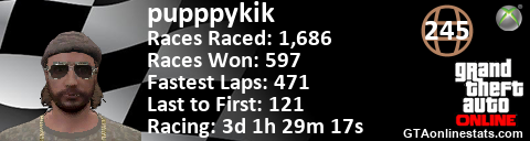 [URL=http://GTAonlinestats.com/showplayer/pupppykik][IMG]http://GTAonlinestats.com/racesignature/pupppykik/sig.png[/IMG][/URL]