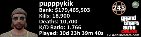 <a href="http://GTAonlinestats.com/showplayer/pupppykik"><img src="http://GTAonlinestats.com/randomsignature/pupppykik/sig.png" alt="pupppykik" border="0" /></a>