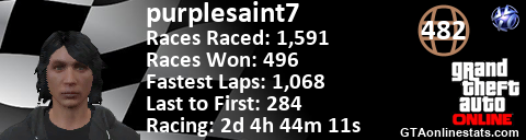 [URL=http://GTAonlinestats.com/showplayer/purplesaint7][IMG]http://GTAonlinestats.com/racesignature/purplesaint7/sig.png[/IMG][/URL]