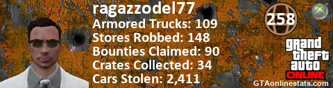 <a href="http://GTAonlinestats.com/showplayer/ragazzodel77"><img src="http://GTAonlinestats.com/crimesignature/ragazzodel77/sig.png" alt="ragazzodel77" border="0" /></a>