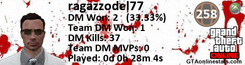 [URL=http://GTAonlinestats.com/showplayer/ragazzodel77][IMG]http://GTAonlinestats.com/dmsignature/ragazzodel77/sig.png[/IMG][/URL]