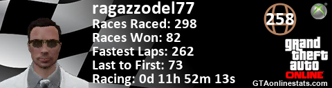 <a href="http://GTAonlinestats.com/showplayer/ragazzodel77"><img src="http://GTAonlinestats.com/racesignature/ragazzodel77/sig.png" alt="ragazzodel77" border="0" /></a>