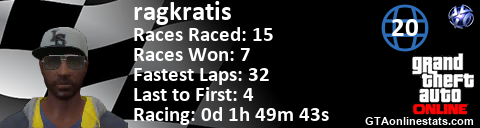 <a href="http://GTAonlinestats.com/showplayer/ragkratis"><img src="http://GTAonlinestats.com/racesignature/ragkratis/sig.png" alt="ragkratis" border="0" /></a>