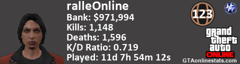 [URL=http://GTAonlinestats.com/showplayer/ralleOnline][IMG]http://GTAonlinestats.com/signature/ralleOnline/sig.png[/IMG][/URL]