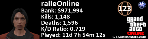 <a href="http://GTAonlinestats.com/showplayer/ralleOnline"><img src="http://GTAonlinestats.com/dmsignature/ralleOnline/sig.png" alt="ralleOnline" border="0" /></a>