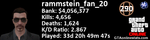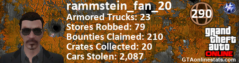 <a href="http://GTAonlinestats.com/showplayer/rammstein_fan_20"><img src="http://GTAonlinestats.com/randomsignature/rammstein_fan_20/sig.png" alt="rammstein_fan_20" border="0" /></a>