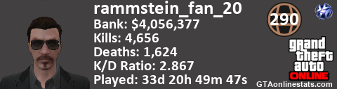 <a href="http://GTAonlinestats.com/showplayer/rammstein_fan_20"><img src="http://GTAonlinestats.com/signature/rammstein_fan_20/sig.png" alt="rammstein_fan_20" border="0" /></a>
