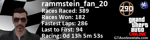<a href="http://GTAonlinestats.com/showplayer/rammstein_fan_20"><img src="http://GTAonlinestats.com/racesignature/rammstein_fan_20/sig.png" alt="rammstein_fan_20" border="0" /></a>