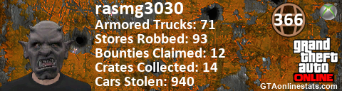 [URL=http://GTAonlinestats.com/showplayer/rasmg3030][IMG]http://GTAonlinestats.com/crimesignature/rasmg3030/sig.png[/IMG][/URL]
