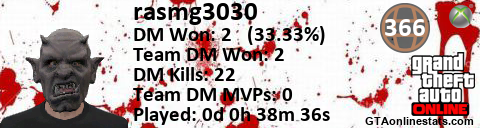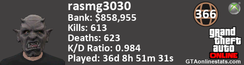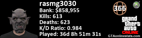 <a href="http://GTAonlinestats.com/showplayer/rasmg3030"><img src="http://GTAonlinestats.com/dmsignature/rasmg3030/sig.png" alt="RaSMG3030" border="0" /></a>