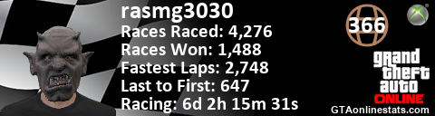 [URL=http://GTAonlinestats.com/showplayer/rasmg3030][IMG]http://GTAonlinestats.com/racesignature/rasmg3030/sig.png[/IMG][/URL]