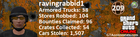 [URL=http://GTAonlinestats.com/showplayer/ravingrabbid1][IMG]http://GTAonlinestats.com/crimesignature/ravingrabbid1/sig.png[/IMG][/URL]