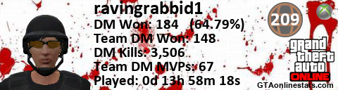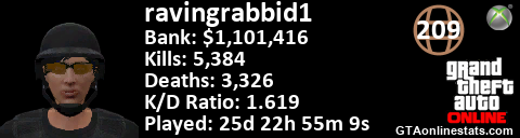 [URL=http://GTAonlinestats.com/showplayer/ravingrabbid1][IMG]http://GTAonlinestats.com/signature/ravingrabbid1/sig.png[/IMG][/URL]