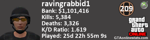 <a href="http://GTAonlinestats.com/showplayer/ravingrabbid1"><img src="http://GTAonlinestats.com/dmsignature/ravingrabbid1/sig.png" alt="ravingrabbid1" border="0" /></a>