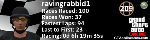 [URL=http://GTAonlinestats.com/showplayer/ravingrabbid1][IMG]http://GTAonlinestats.com/racesignature/ravingrabbid1/sig.png[/IMG][/URL]