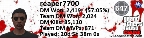 [URL=http://GTAonlinestats.com/showplayer/reaper7700][IMG]http://GTAonlinestats.com/dmsignature/reaper7700/sig.png[/IMG][/URL]