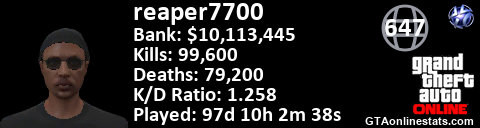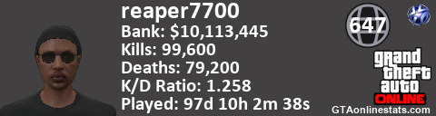 <a href="http://GTAonlinestats.com/showplayer/reaper7700"><img src="http://GTAonlinestats.com/dmsignature/reaper7700/sig.png" alt="reaper7700" border="0" /></a>