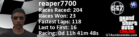 <a href="http://GTAonlinestats.com/showplayer/reaper7700"><img src="http://GTAonlinestats.com/racesignature/reaper7700/sig.png" alt="reaper7700" border="0" /></a>