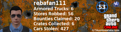 <a href="http://GTAonlinestats.com/showplayer/rebafan111"><img src="http://GTAonlinestats.com/crimesignature/rebafan111/sig.png" alt="rebafan111" border="0" /></a>